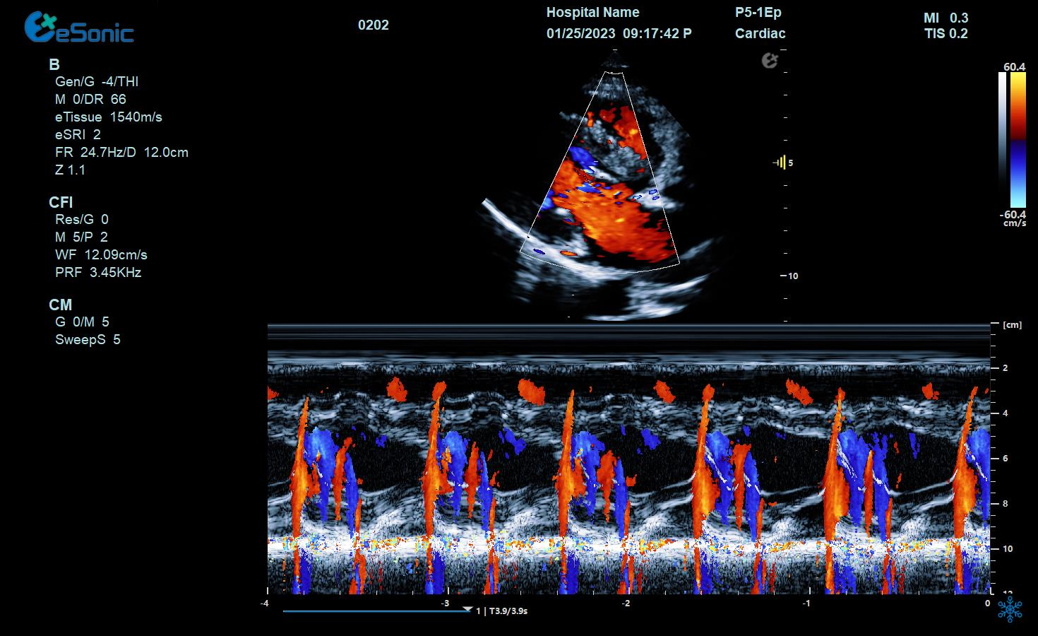 超声声像图:显示左、右侧心房及心室、房室间隔;二、三尖瓣的形态及结构;心腔血流灌注、瓣膜返流等。