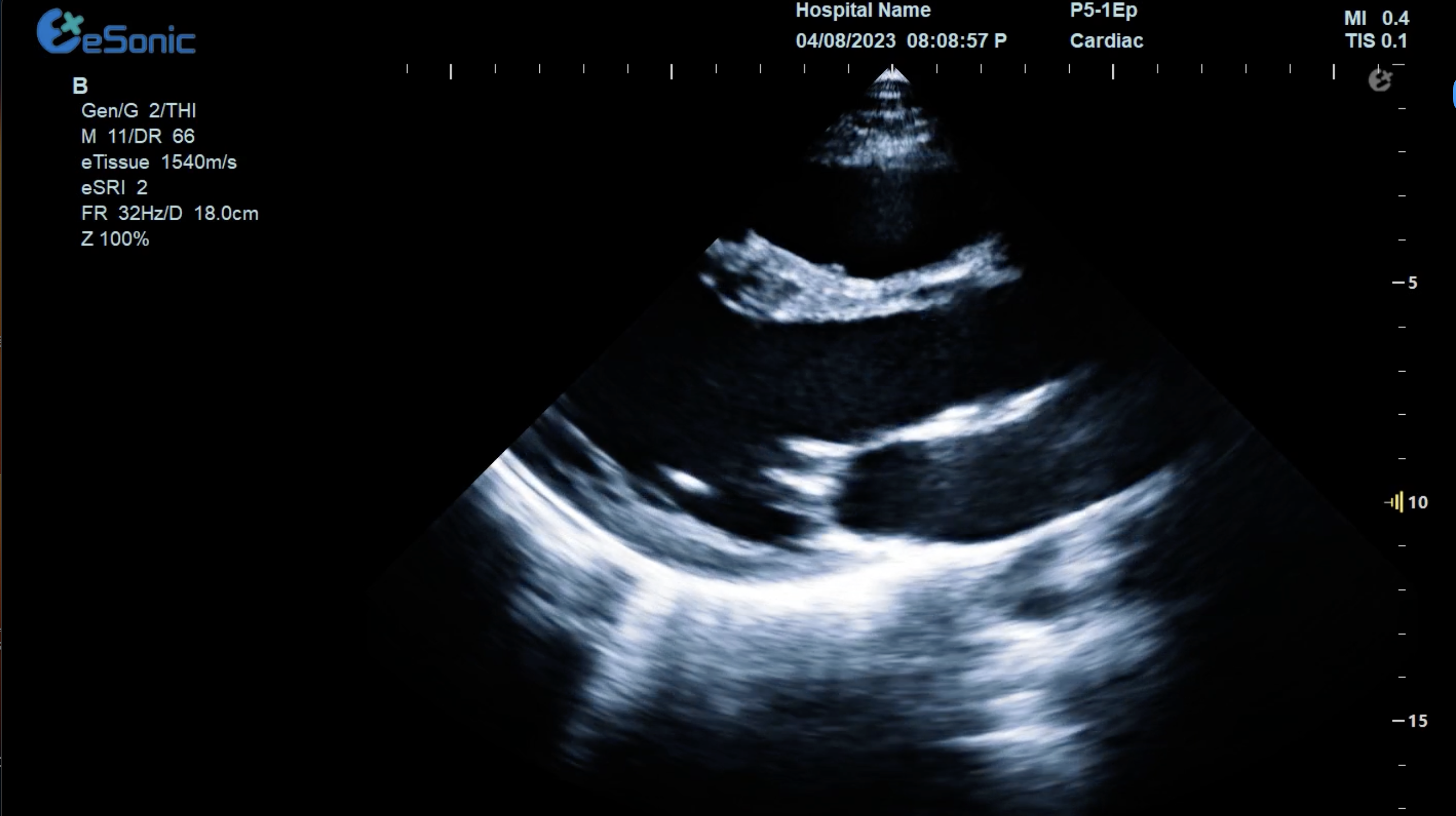 超声声像图:图像近场扇尖处可见肝实质反射,此切面可观察左心房、左心室、右心房、右心室、房间隔、室间隔、二尖瓣、三尖瓣等结构。